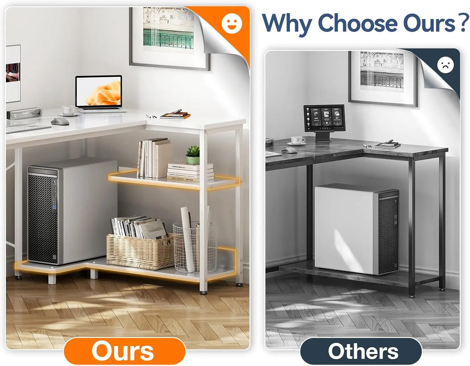 The reversible L-shaped layout offers flexible setup options, allowing you to customize the desk to fit your room’s layout and personal preference. Whether you prefer your workspace on the left or right, this desk adapts to your needs effortlessly.